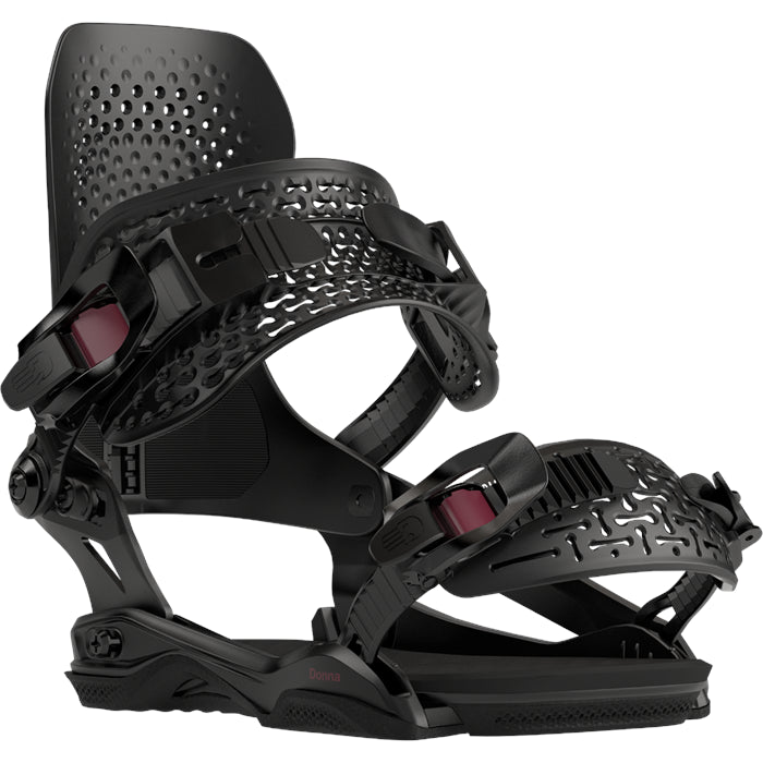 The Donna AW is your go-to women's all-mountain binding, designed with the Asymwrap chassis. The smaller Quarterback highback is tailored to women's boot sizes, ensuring a precise fit while offerring a perfect blend of side-to-side flex and toe-to-heel responsiveness. Customize your ride with an adjustable Asymwrap heelcup, three FootPad positions, and highback rotation for enhanced heelside performance. Enjoy the ultimate in comfort and versatility for your all-mountain adventures