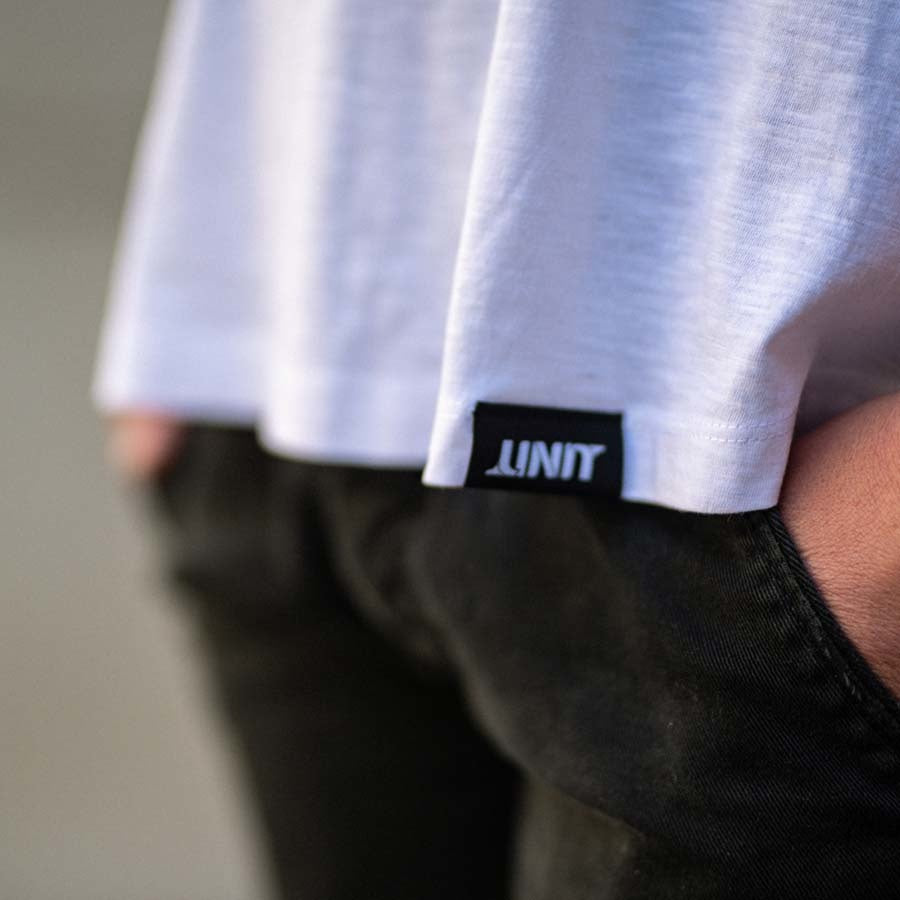 100% combed, ring-spun organic cotton, casual medium fit, 130 g/m², incl. sewn-on UNIT label at the hem.