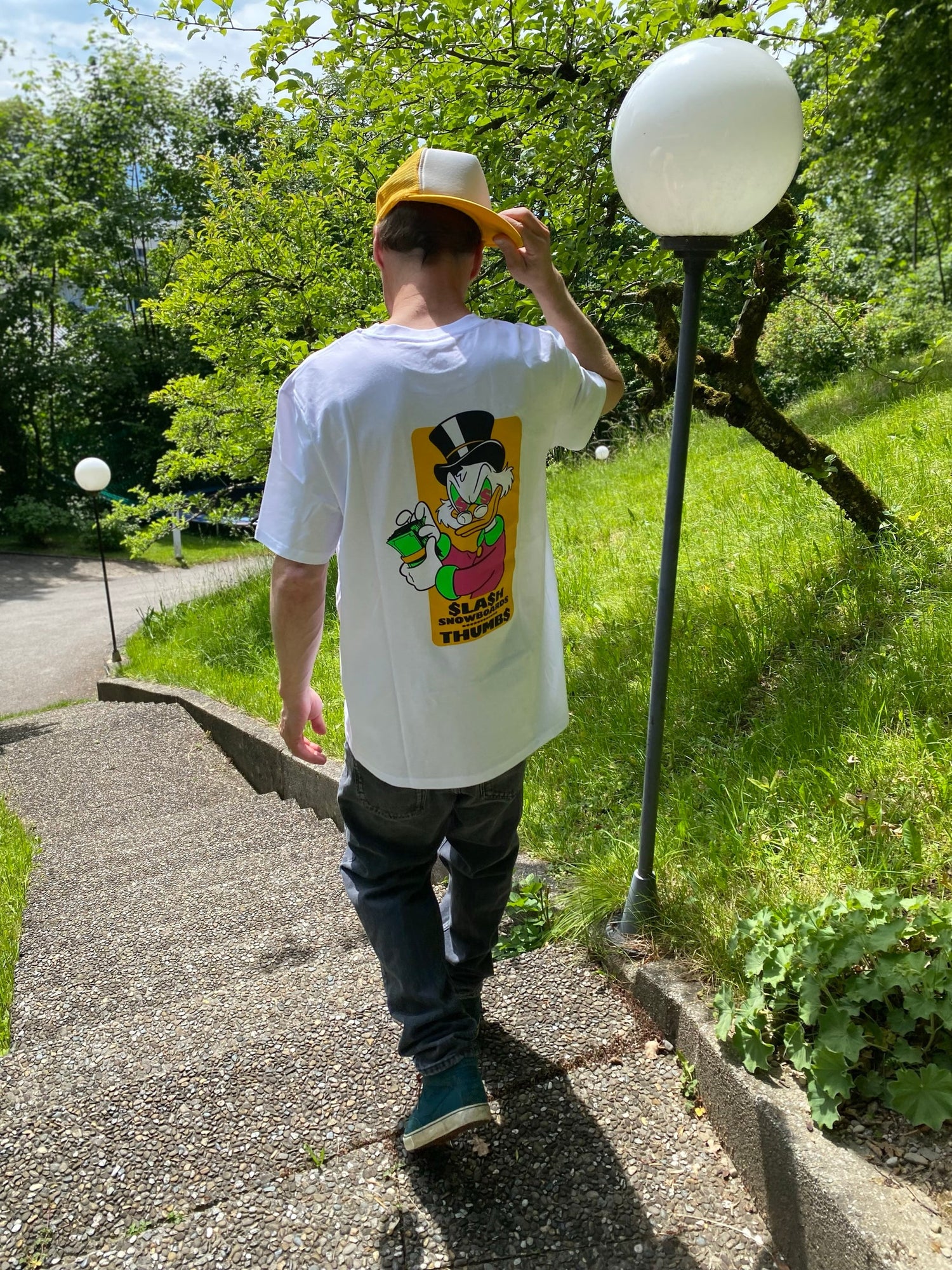 A classic white tee, reimagined by SLASH and UK artist Thumbs. The SLASH Scrooge McDuck T-Shirt features a bold, original back print that flips nostalgia on its head—a throwback to ‘90s skate graphics.