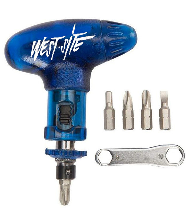 Snowboard tool with left-right thread and a hexagon key including four bits stored in the handle.
