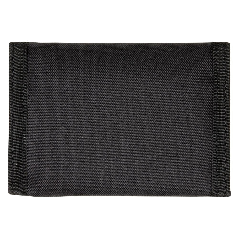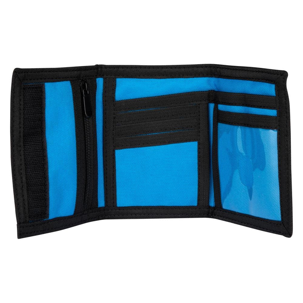 100% polyester, canvas tri-fold wallet, inside zip coin pocket, card and note slots with ID window and front print